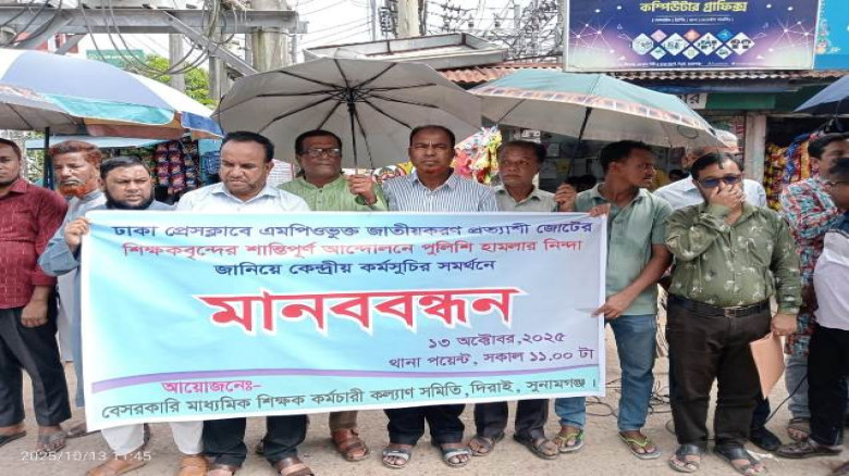 সোমবার দুপুরে দিরাই মডেল উচ্চ বিদ্যালয়ের প্রধান শিক্ষক সব্যসাচী দাসের সভাপতিত্বে ও মাধ্যমিক শিক্ষক কর্মচারী কল্যান সমিতির সাধারণ সম্পাদক সূর্যসেন দাস পান্নার পরিচালনায় মানববন্ধনে